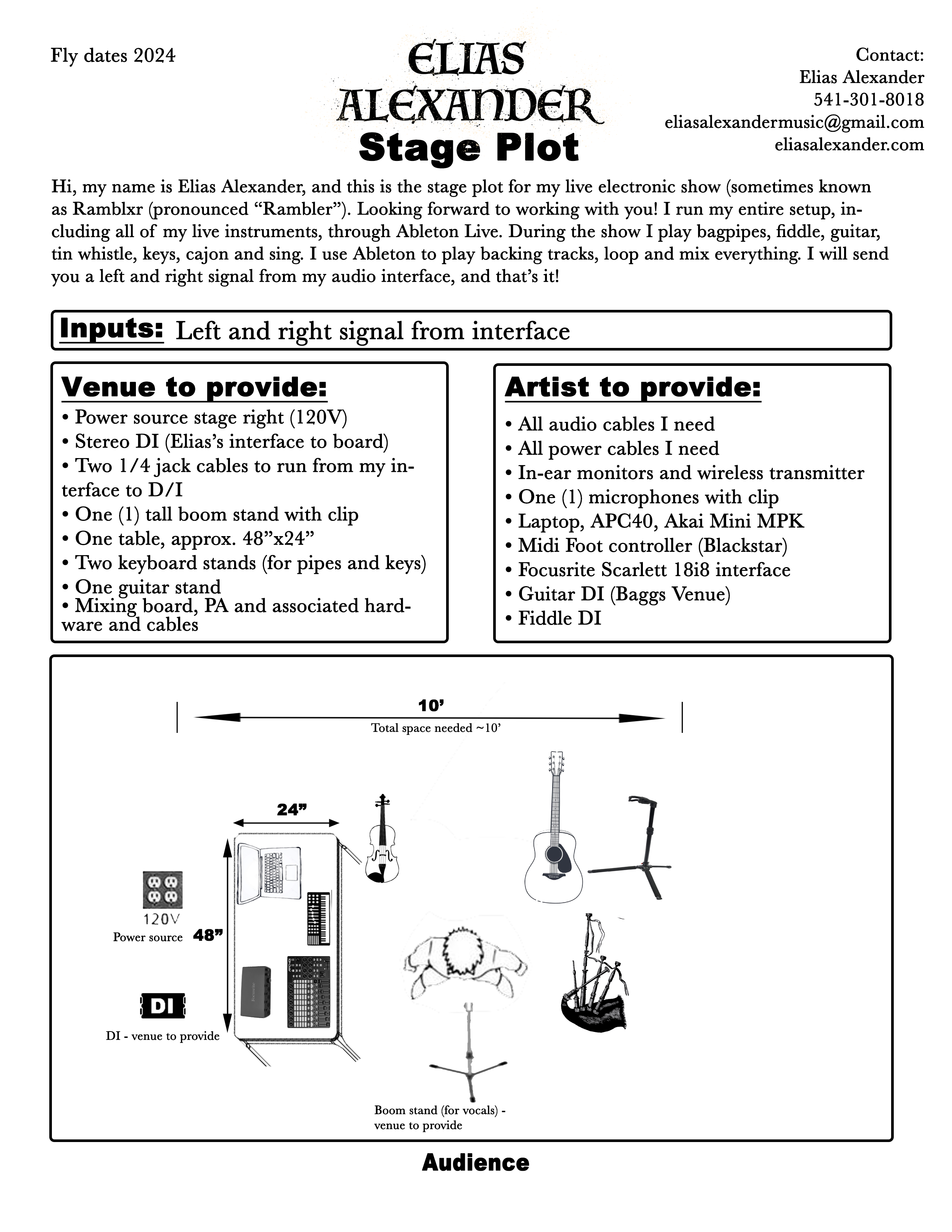 Elias Alexander is a rare performer who combines live looping and electronics with a wide variety of instruments from bagpipes to fiddle, guitar, whistle and keys. With deep roots in traditional Scottish and American music, but a boundless appetite for possibility, rhythm, and expression, Elias takes audiences on a mind blowing journey through traditional tunes, original songs, and danceable fun.